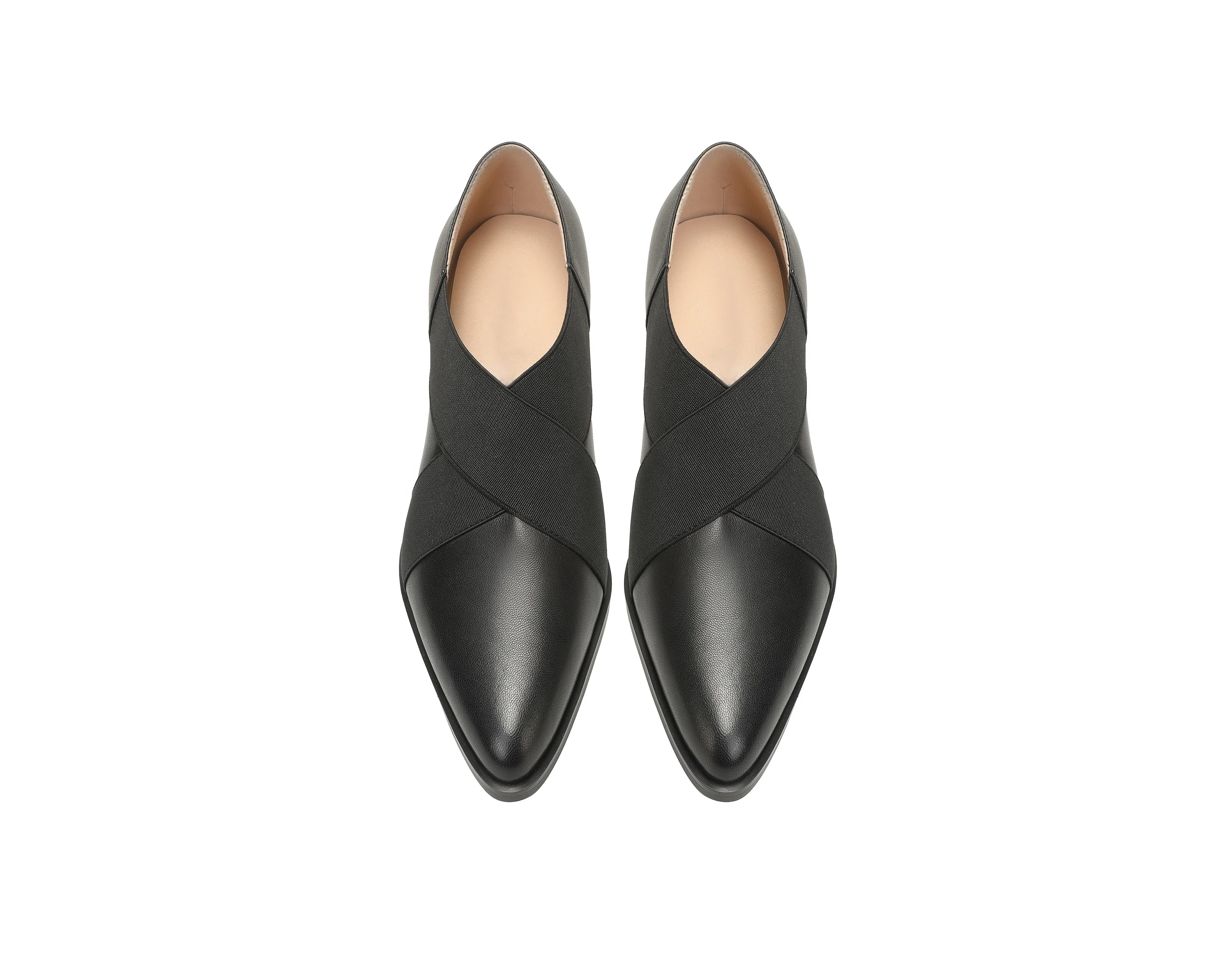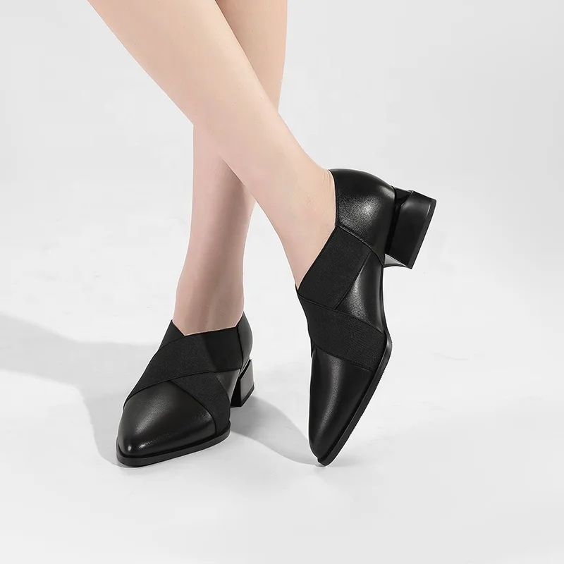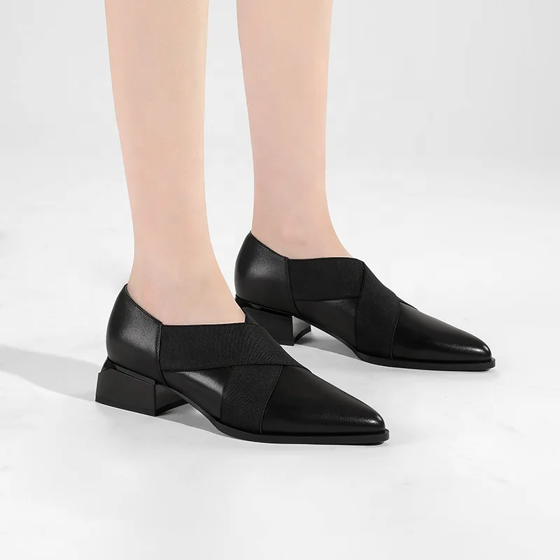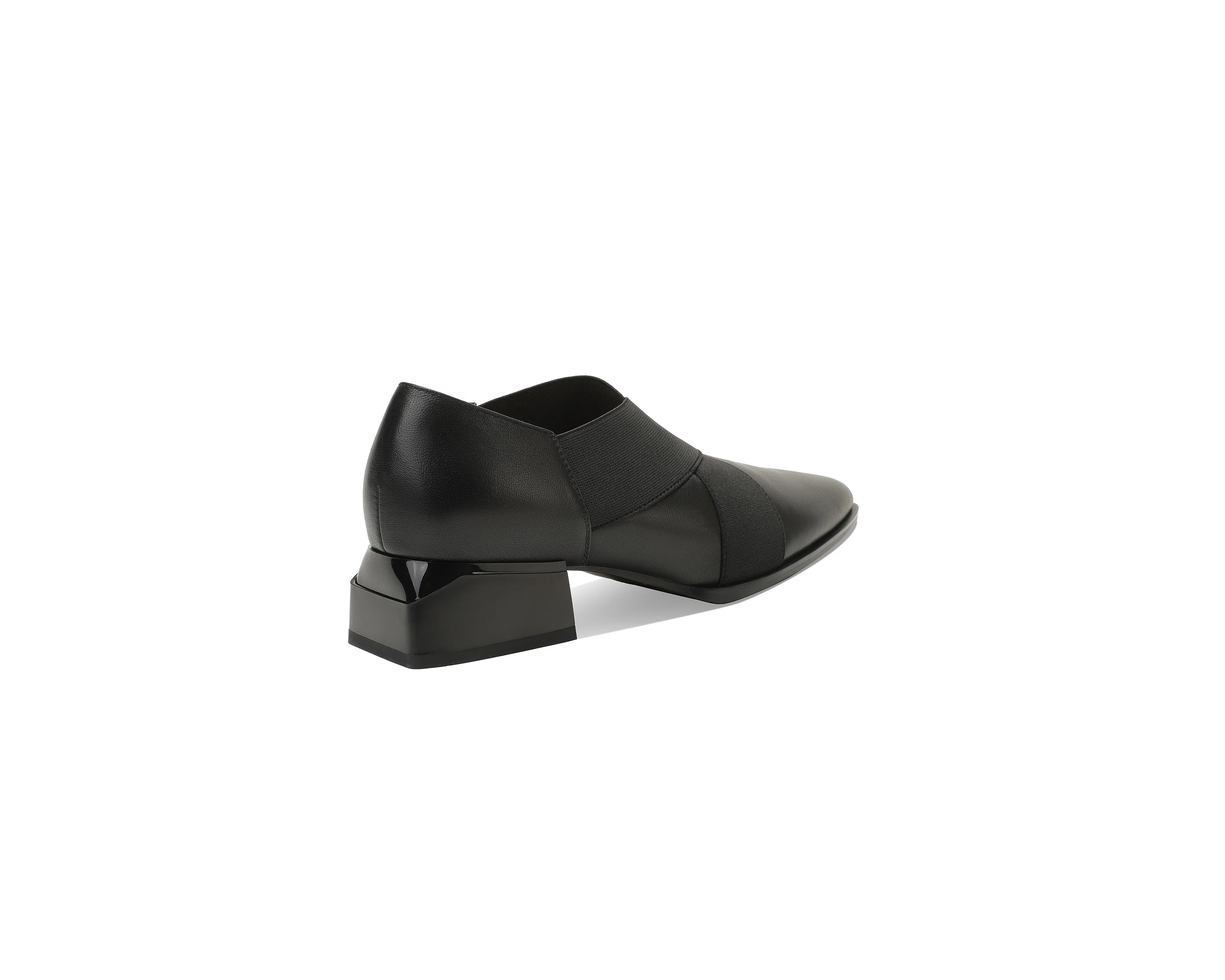 Women's Black Slip-On Dress Shoes with Pointed Toe and Chunky Heel Comfortable Elastic Band Light Weight Pumps